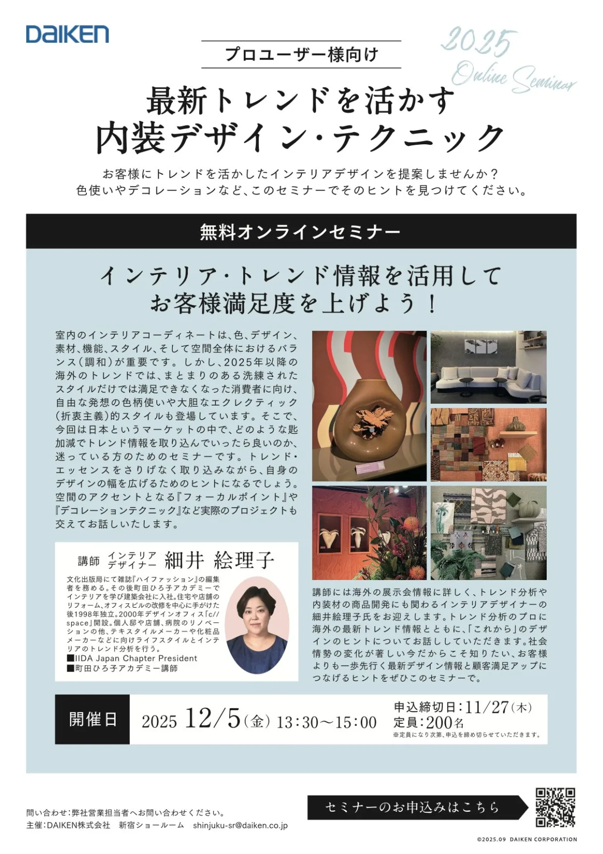 2025年12月5日(金)、町田ひろ子アカデミー東京校講師であるインテリアコーディネーター・細井絵理子氏が、オンラインセミナー「最新トレンドを活かす内装デザイン・テクニック」に登壇いたします。