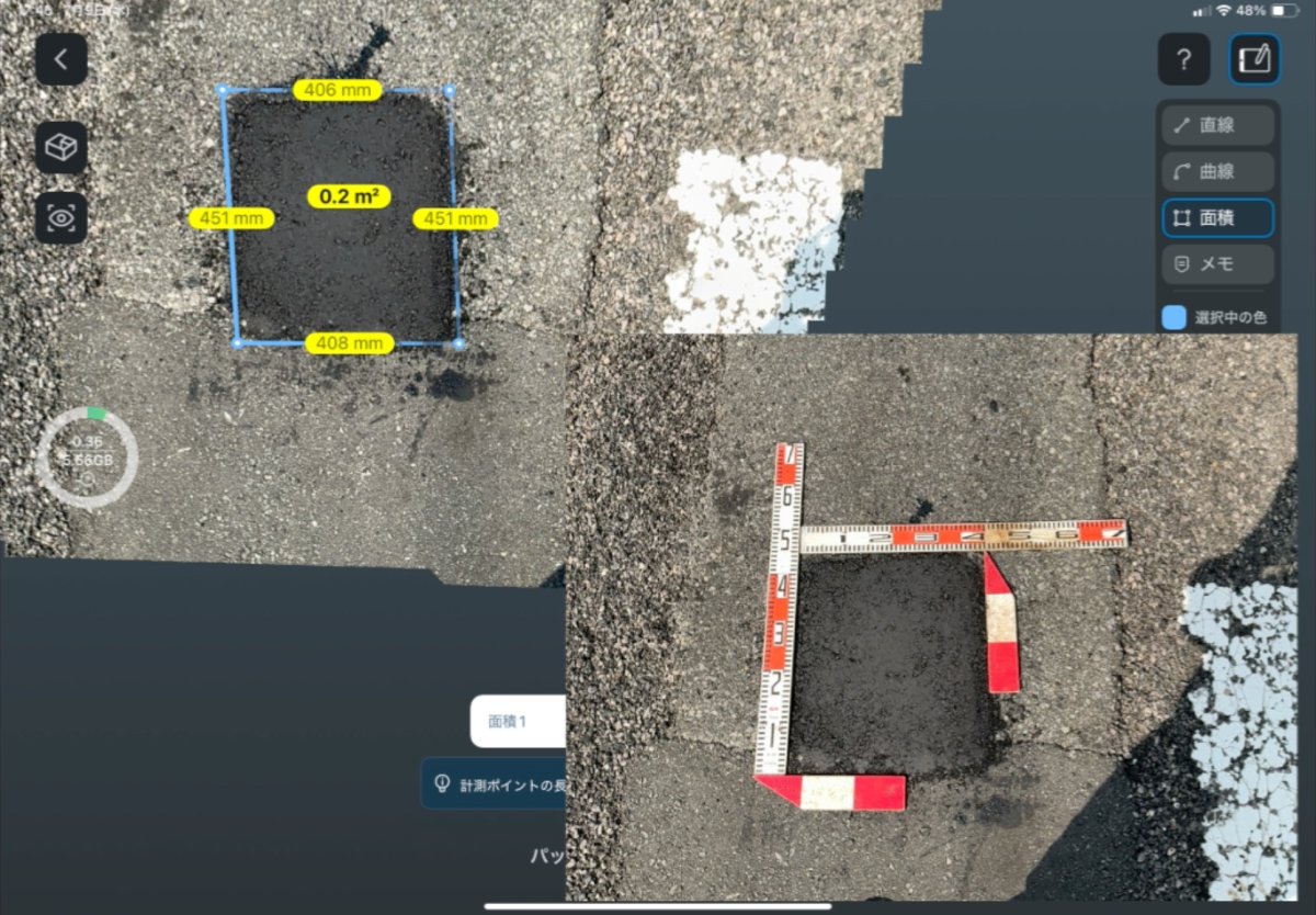 例えば 舗装補修面積の計測 橋梁やトンネルの補強シート面積の計測 こうした作業では、従来のテープによる測定に代わってモバイル端末での計測が可能となり、実際に現場での利用が広がっています。