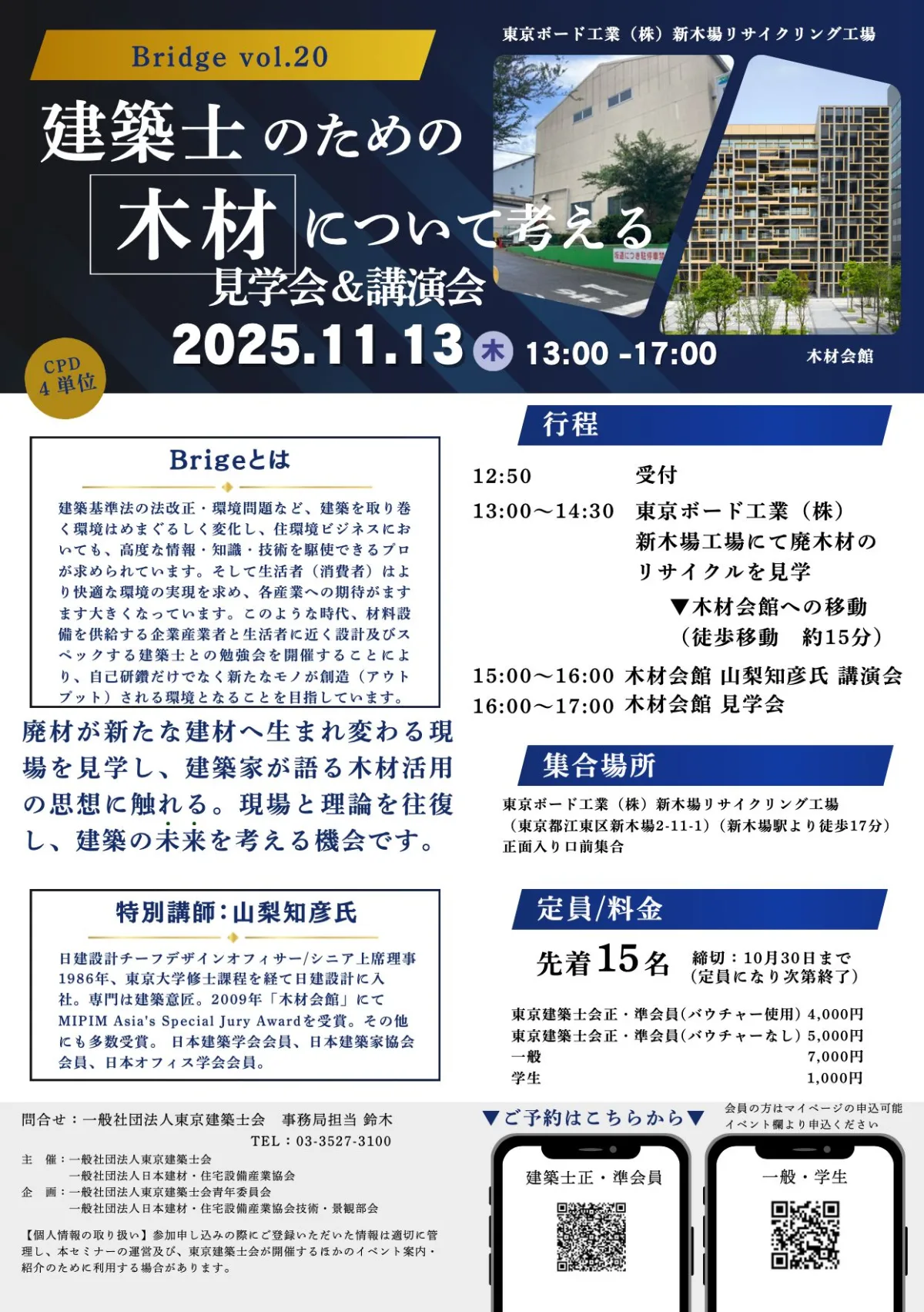 2025年11月13日(水)に開催される、東京建築士会 青年委員会 Bridge Vol.20『木』に、nat株式会社が参加いたします。