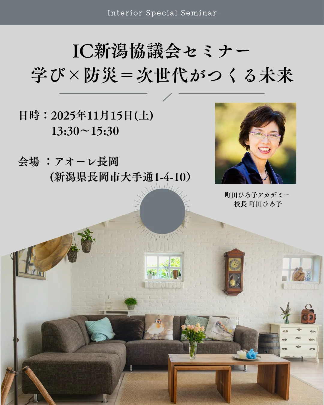 2025年11月15日(土)、インテリアコーディネーター新潟協議会が開催するセミナーにて、アカデミー校長である町田ひろ子が講師として登壇します。